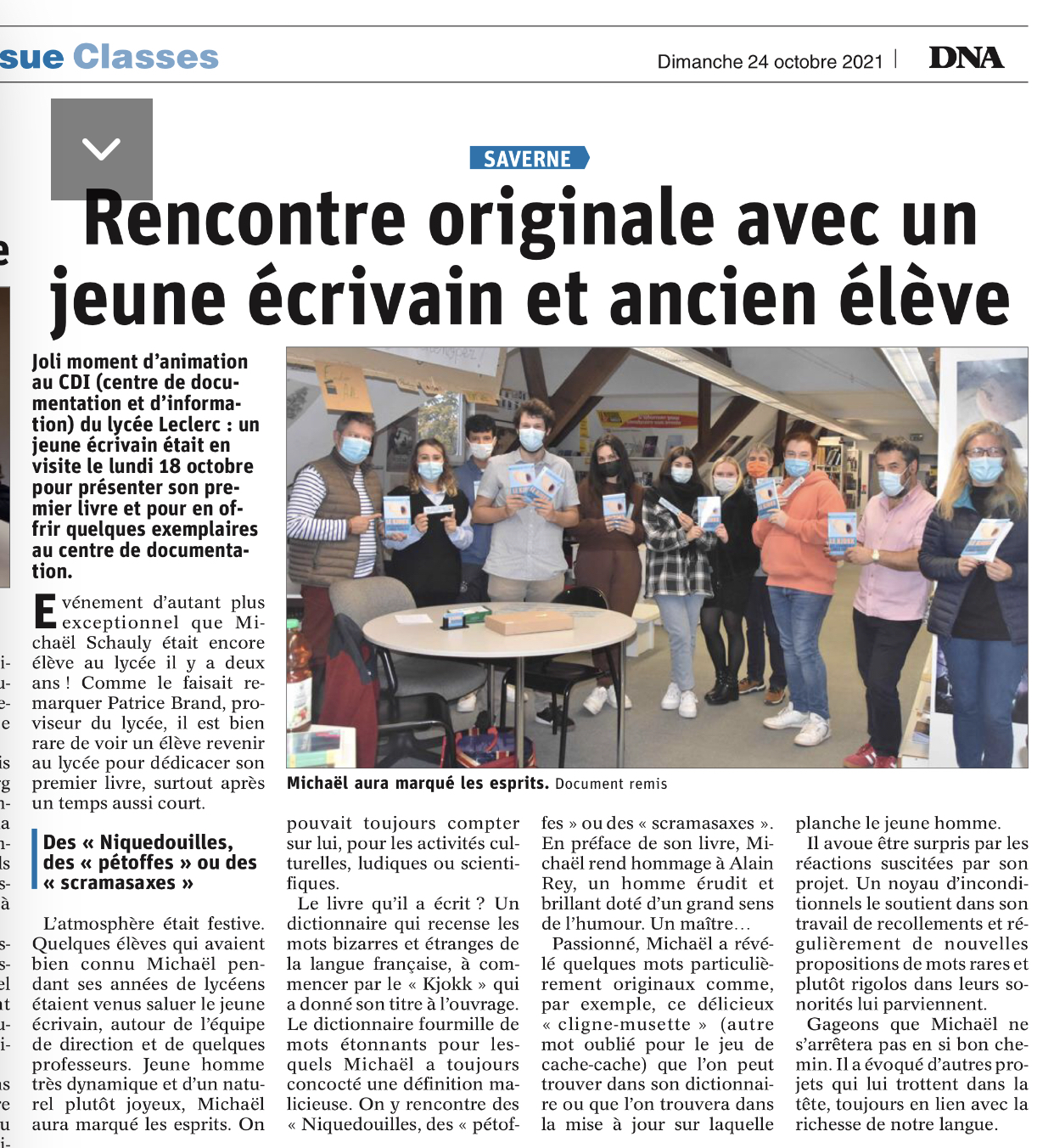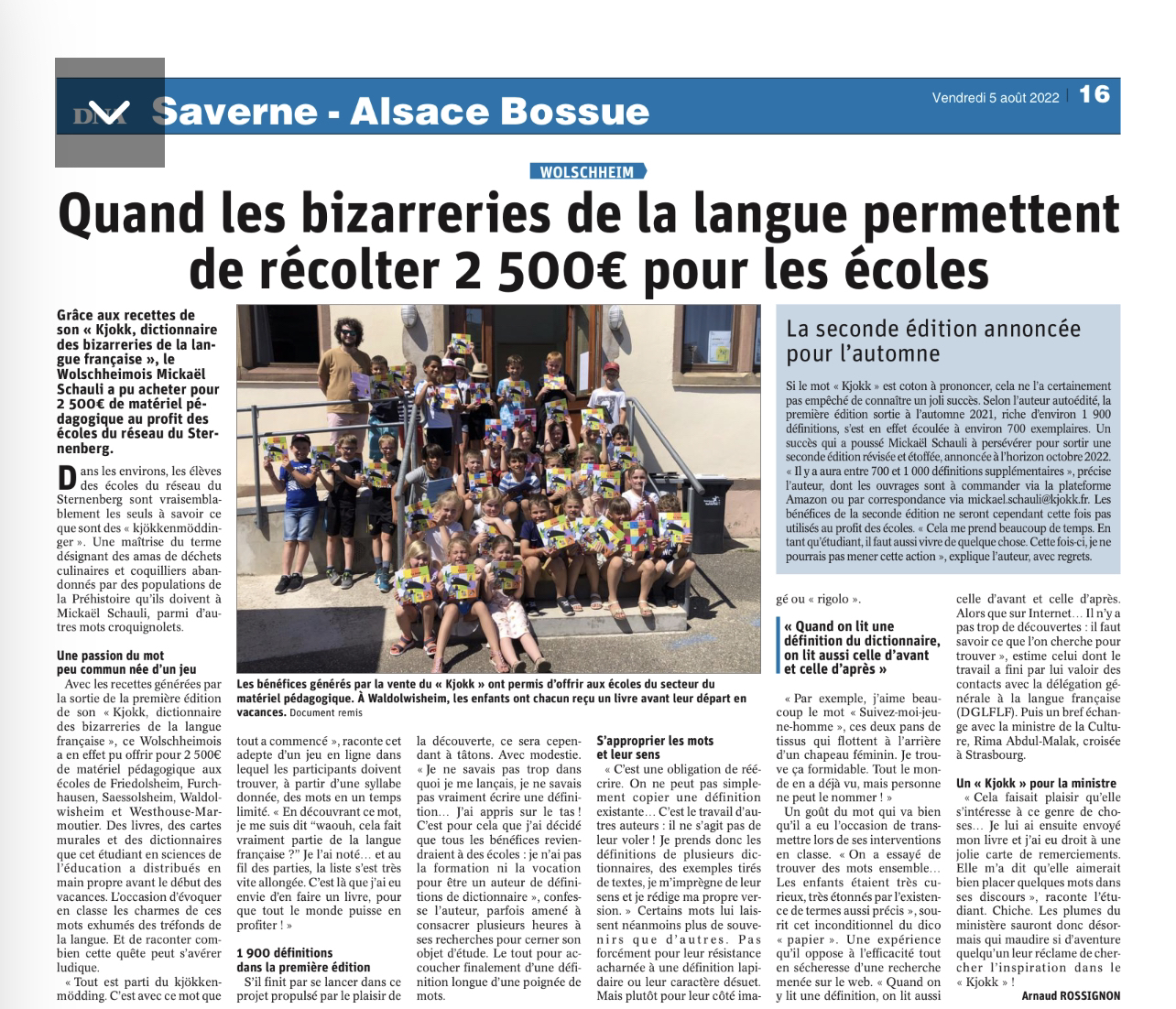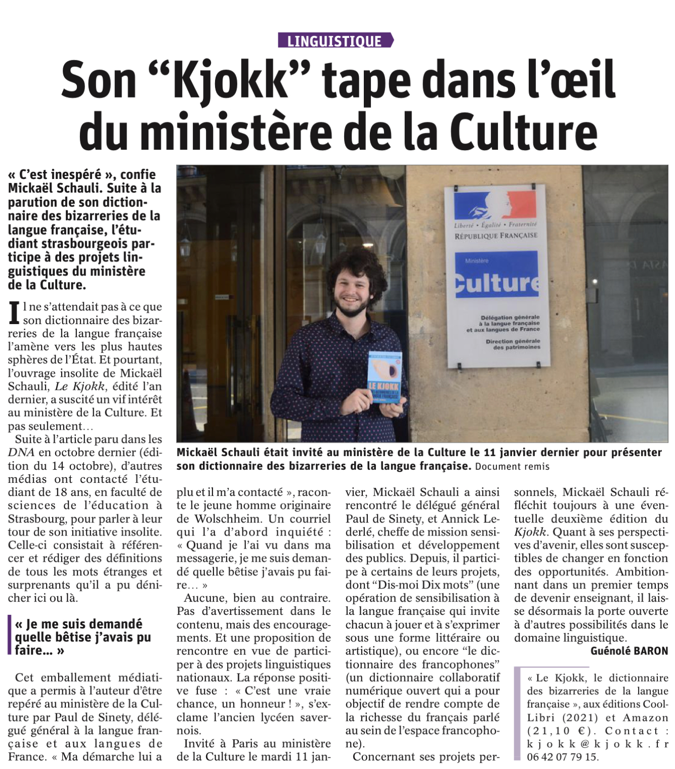 Mickaël Schauli, né en Alsace en décembre 2002 est le jeune auteur du Kjokk, dictionnaire des bizarreries de la langue française. Passionné par la langue française et ses subtilités, il aime partager au monde son amour pour les mots.